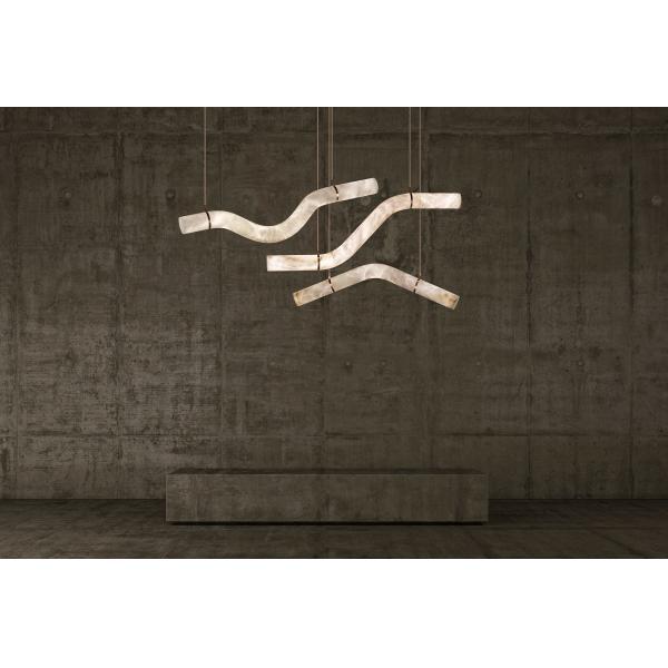 Crafted from luminous alabaster tubes, LIBERTY diffuses a warm, ambient glow that softens interiors while maintaining structural boldness. The interplay of light and material is accentuated by meticulously finished rings in bronze or brass, available in chrome-plated, glossy gold, or satin finishes. These metallic accents elevate the design, adding a touch of opulence to its clean geometric lines. The juxtaposition of raw alabaster and polished metal creates a tactile contrast, appealing to both contemporary and classic sensibilities.